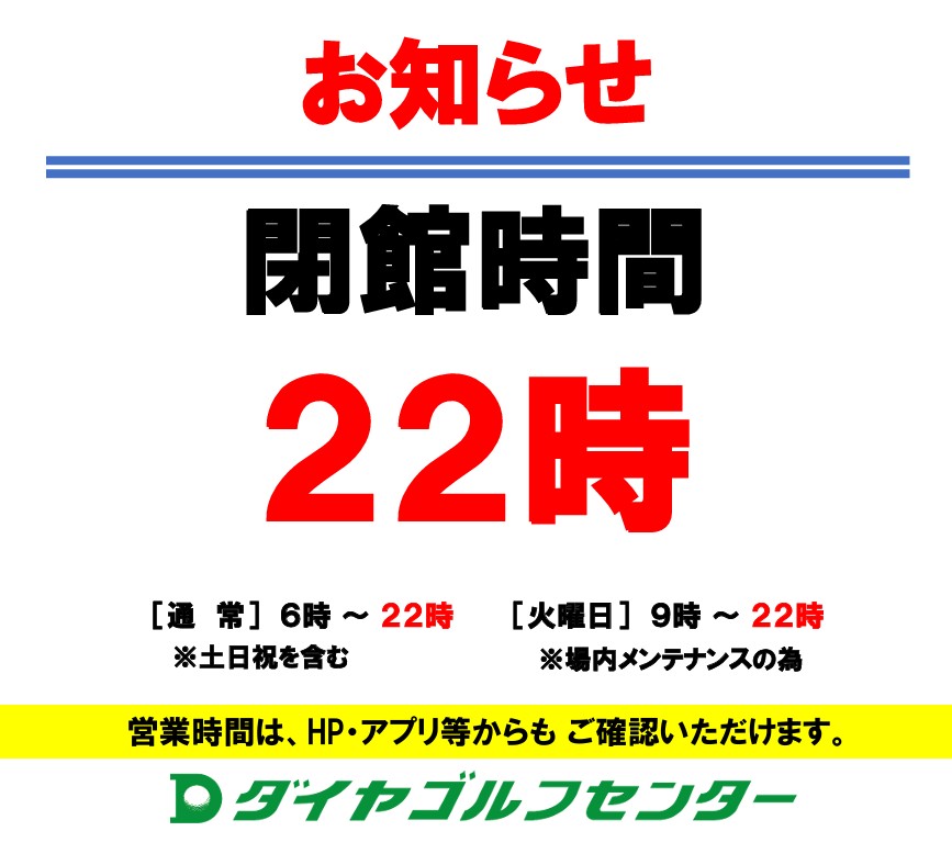 ダイヤゴルフセンター閉館時間のお知らせ